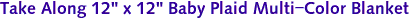 HomeWholesale Products : Garden Lane items-Blankets, Bibs and More! : Take Along Small 12" x 12" Size PolarfleeceŽ Blankets : Take Along 12" x 12" Baby Plaid Multi-Color Blanket![]() Our charming Baby Print Take-Along PolarfleeceŽ Blanket is that special bit of soft cozy comfort that is just the right size for kids on the go! This small 12" x 12" blanket is made in the USA from Genuine Original PolarfleeceŽ from Malden Mills in Prints made exclusivly for us! It has a 1/2" polar fleece binding that forms a loop at one corner. Just perfect when a full sized blanket is too much like in the car, stroller, or for an outing. Add your own personalization to this blanket and you will make someone very happy! 100% Polyester Polar Fleece. Easy Care. Warm Wash, Tumble Dry. These Take-Along sized blankets are also available in Solid Color Yellow, White, Pink, and Blue (Item# 61-130T), Color Contrast White with Pink and White with Blue (Item# 61-140T) and Exclusive Blue or Pink Stars and Moon Print (Item# 61-150T). |